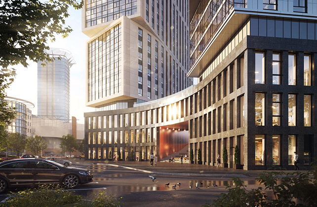 6 подъездов, 8 этажей, двухуровневый подземный паркинг, коммерция на первом этаже