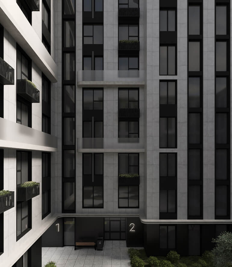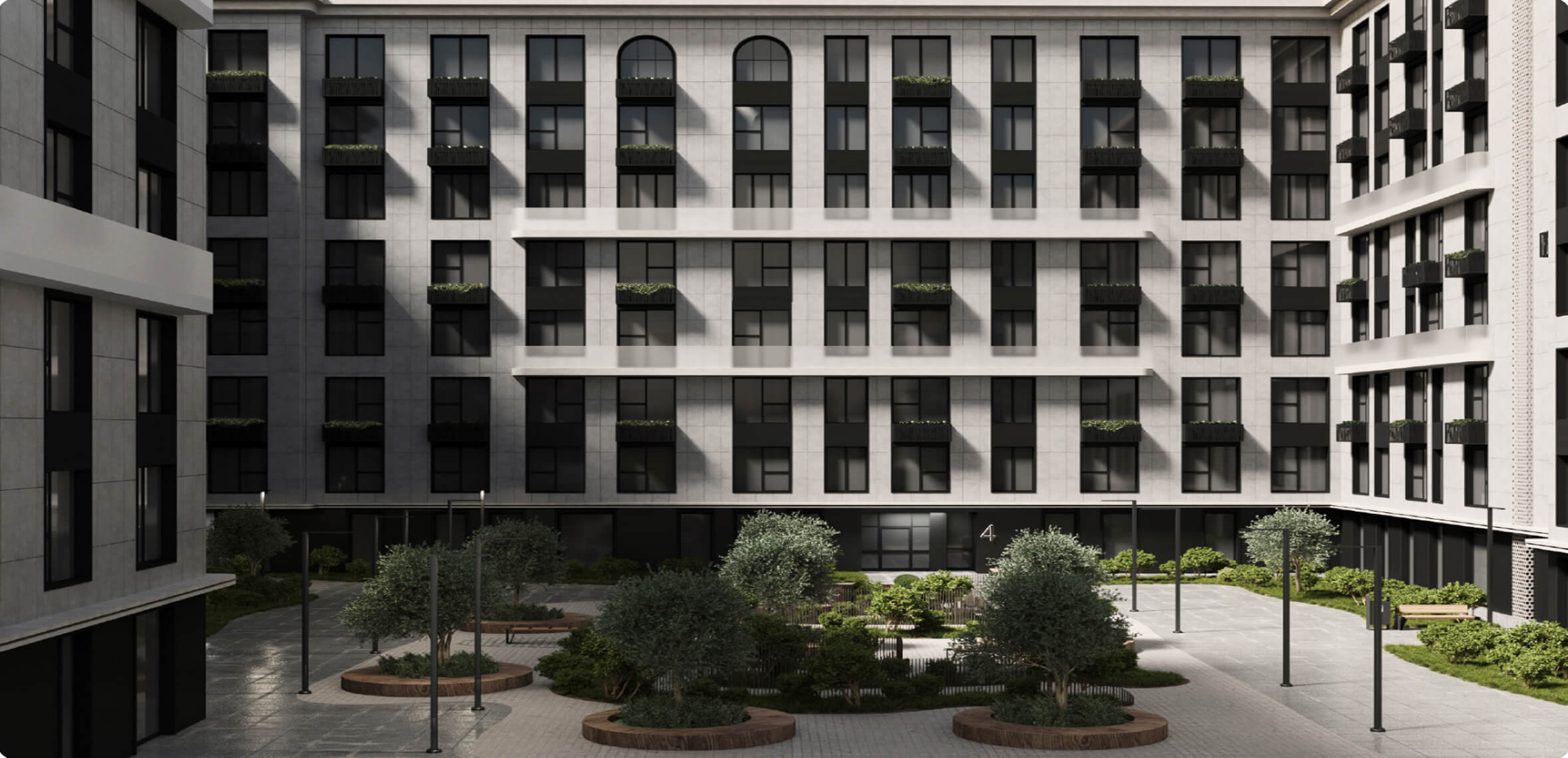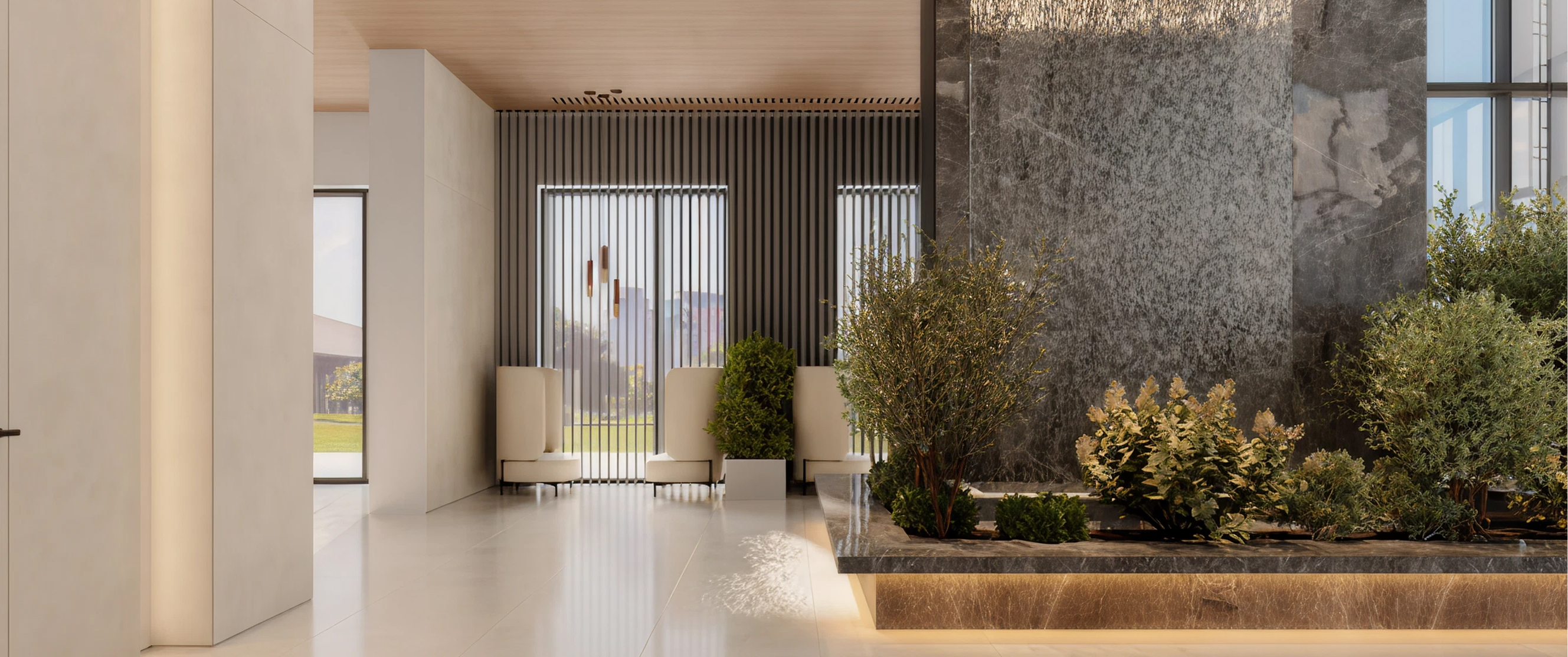 Потолки высотой 4 метра, изящные стеклянные двери в черных алюминиевых рамах, отделка керамогранитом — все говорит о статусе и внимании к деталям. У каждого холла свой неповторимый характер и собственное имя, вдохновленное садовой темой. Внутри — уютные места для ожидания, колясочные, лапомойки, гостевые санузлы. Современные лифты METEOR, видеонаблюдение и домофонная система обеспечивают комфорт и безопасность.